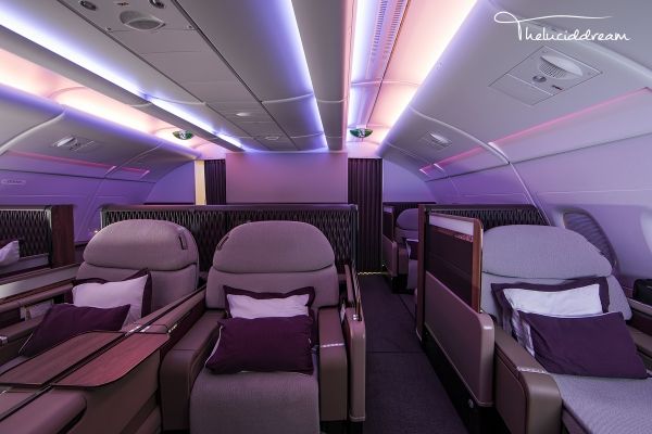 卡航A380头等舱共8个座位,位于上层前段。卡航出了名的CEO也是很有个性的人,别人搞得东西他从来不搞,没有封闭式的包厢,没有空中浴室,没有过多金色的装饰,他把更多的重心放在了服务和理念的创新上。