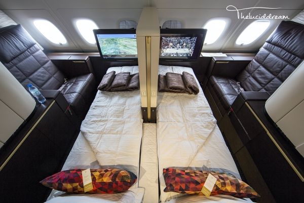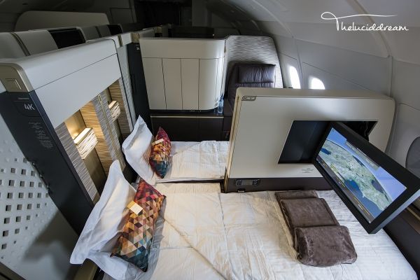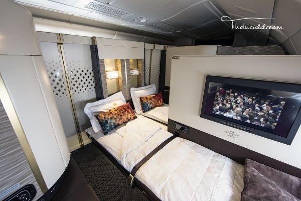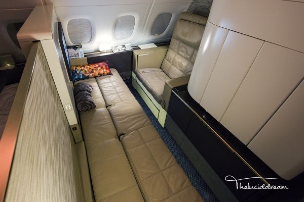 阿提哈德航空凭借这款颠覆的头等舱已连续两年荣获全球最佳头等舱称号。这是全球首个在宽体客机上使用1-1布局的舱位,房间内包括一张宽30.3英寸带有记忆按摩功能的沙发,一张长80.5英寸的长椅,打开后可变为26英寸宽的单人床,除此之外还有带有制冷功能的迷你雪柜,化妆镜等。等人高的推拉门关闭后可确保房间的私密性。