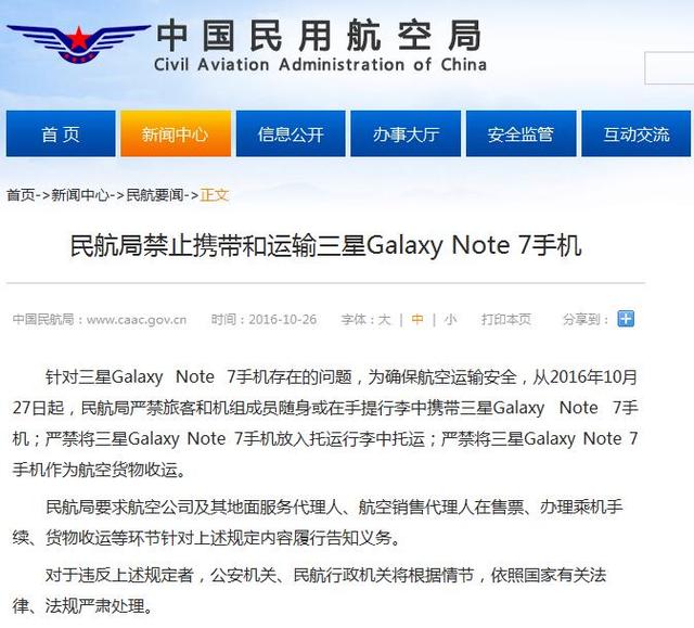 10月26日,中国民航局表示,针对三星Galaxy Note 7手机存在的问题,为确保航空运输安全,从2016年10月27日起,民航局严禁旅客和机组成员随身或在手提行李中携带三星Galaxy Note 7手机;严禁将三星Galaxy Note 7手机放入托运行李中托运;严禁将三星Galaxy Note 7手机作为航空货物收运。