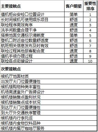 与此同时,有了更为详尽的数据,将对旅行体验提升这块提出更高的要求,除了航空公司本身服务流程的优化,他们还提到一点,做为旅行中重要的体验环节,机场候机楼的服务设计和体验也至关重要,而这是航空公司和机场共同参与的过程。他们认为在将来,航空公司、机场、联检,甚至酒店、租车公司等都会纳入到这个大的Eco-system中,机场和航空公司之间的协作将更为紧密。目前来看,机场需要向旅客销售产品和航空公司也同样,他们面对的是同一位客户,所以从销售看,是一种上下游的关系。但是从服务流程看,旅客在机场的服务体验在整体飞行体验中有着非常重要的作用,反之亦然。例如,很多国际旅客认为航空公司在航班即将到达时为他们派发入境卡的服务很贴心,航空公司的服务不仅为旅客后续入境带来便捷,也为机场联检现场的管理减轻压力;又例如,一些商务旅客认为机场的手机二维码安检通道非常便捷,可以帮助他们完全省去在柜台办理航班的程序,使行程更加紧凑。这也为航空公司在旅客登机管理,商务旅客飞行体验设计方面带来便利。在将来,大Eco-system中的各主体如果能有更多有效联动和服务创新设计,将必定带动旅客整体服务体验的大幅提升。由此,我也想到了前不久在一个知名客户管理网站上看到的机场客户体验关注点调查报告。这份报告从旅客服务体验感知层面,对机场内的各接触点对整体服务体验的影响按重要性进行了排序。