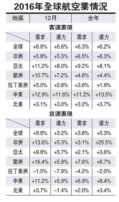 2016年内,国际航线客运量升6.7%,运力增长6.9%,各区域的航空公司国际航线需求均实现增长。国内航线方面,去年客运需求升5.7%,运力增长5.1%。除了巴西市场,其他区域航空公司均实现增长,印度和中国国内航线需求升幅更分别达23.3%和11.7%。去年12月,全球航空客运需求增长8.8%,运力升6.6%。