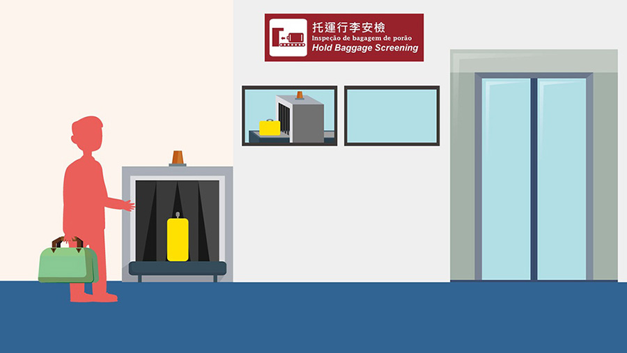 地勤人员会向出境旅客的托运行李发出行李标籤,旅客须要带同托运行李前往办理登机手续区内指定的<托运行李安检>通道,并投放行李到相关的X光机进行安全检查。当旅客投放行李后,必须留意显示屏,以确保行李通过X光机。若旅客的姓名及航班编号出现在显示屏时,旅客须要配合进入安检室,协助保安检查行李。若旅客资料没有在显示屏出现,即其托运行李已成功通过安检,并会被运送至其搭乘的航班。旅客便可前往离境禁区。所有旅客完成手续后,应尽快前往离境禁区进行旅客安全检查及办理出境手续。