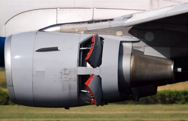 客机降落时,发动机的一部份会打开,发出很大的巨响,这是推力反向器。推力反向器是在发动机上改变气流方向的装置,使发动机的气流转向前方,而非向后喷射,让发动机的推力倒转而使飞机减速。