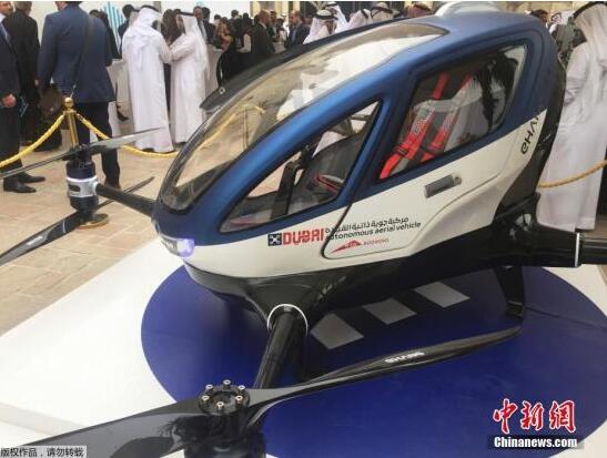 报道称,飞行出租车如同直升机垂直升起和降落。新的技术令人类的梦想成为现实。将在迪拜试运行的空中出租车装有18个圆形螺旋桨,可以搭载2名乘客。