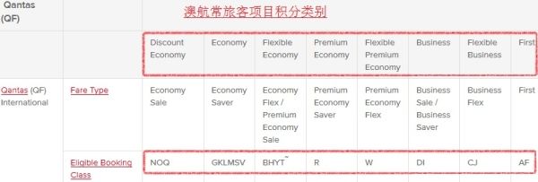 图:澳航常旅客项目不同机票对应的类别 图片来源:《澳大利亚商务旅行者》