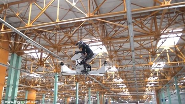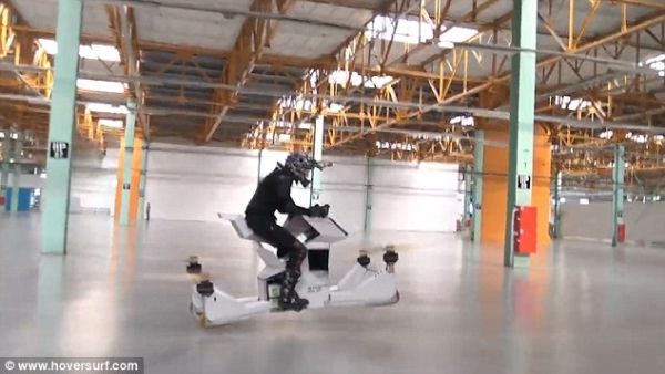 制造商Hoversurf制造的此架单座飞行器天蝎Ⅲ(Scorpion-3),可搭载一名乘客飞行,并完全由其操纵。该设备融合常规摩托设计与无人机技术。乘客可在天空中像骑自行车般操纵它。