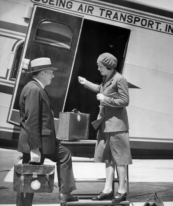 1930年,来自美国爱荷华州25岁的注册护士艾伦·丘奇在一架波音80A舱门口迎接客人。