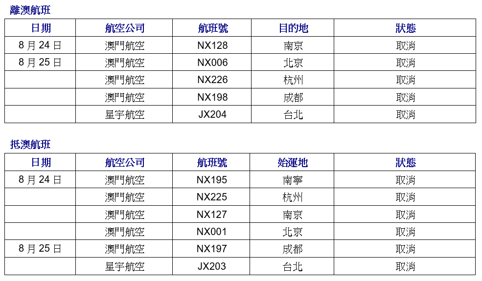 因受到颱风“马鞍”的影响,澳门国际机场航班资料更新信息 2022年08月24日 20时15分