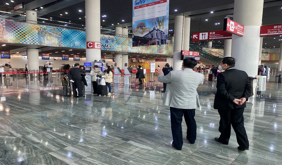 近日本澳受到新冠病毒感染之影响,为实地了解澳门国际机场之营运情况,於2022年12月30日上午,澳门国际机场专营股份有限公司(CAM)执行董事朱丹宁先生及简焯坤先生,在机场营运部总监耿亚军先生及澳门保安有限公司董事副总经理张小兵先生的陪同下,到机场了解前线营运、安保及各分营商经营之状况,确保机场在元旦节假日期间有足够的人力应对工作。 执行董事亦藉此向全体上班的前线员工表达关心及慰问,感谢各前线员工在这艰难时期仍坚守岗位,克尽己任。