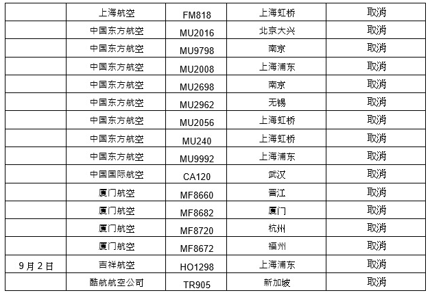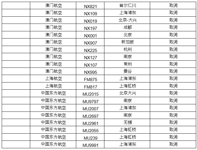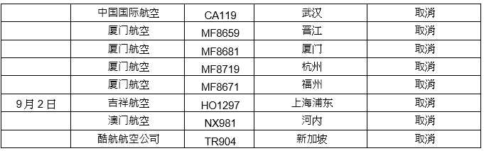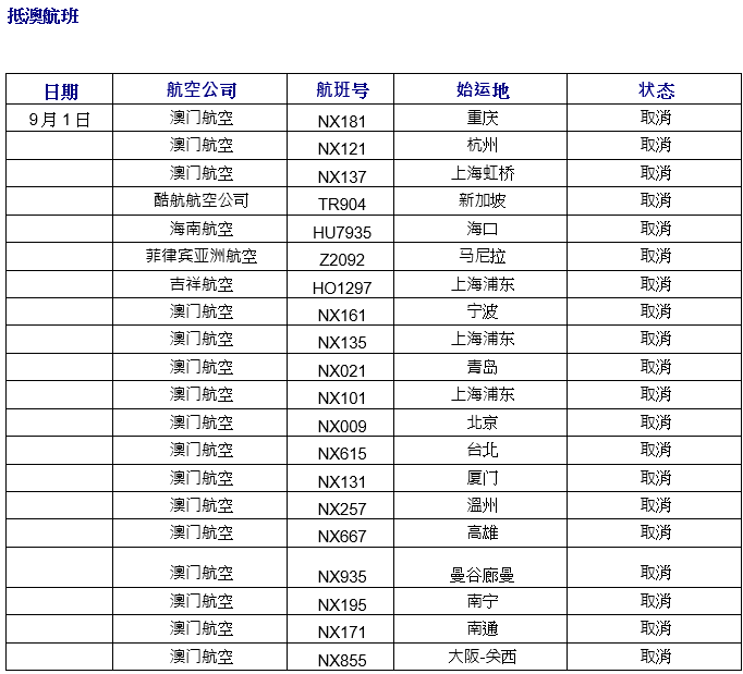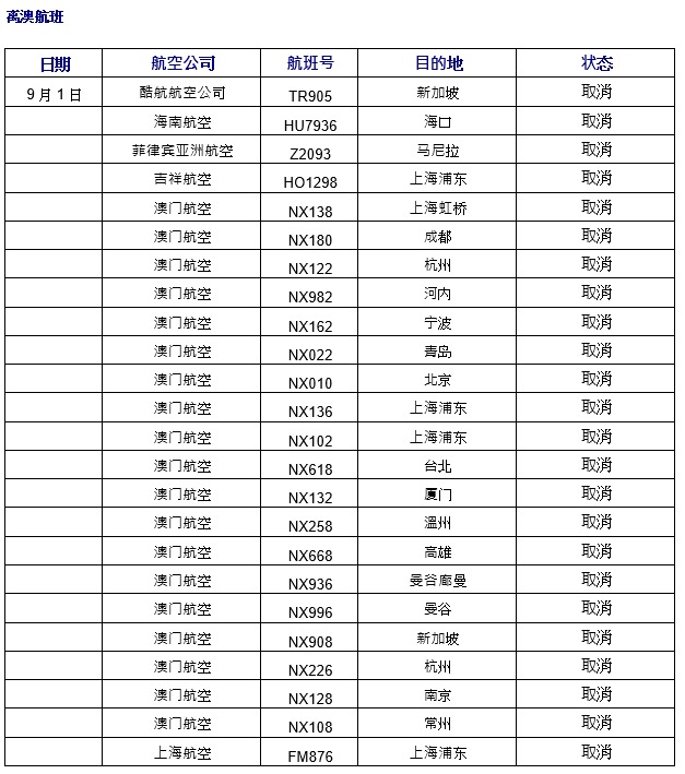 由於受到颱风“蘇拉”的影响,澳门国际机场收到航空公司通知乘客以下航班将会取消。乘客出发前请与相关的航空公司联繋其航班的更新情况。