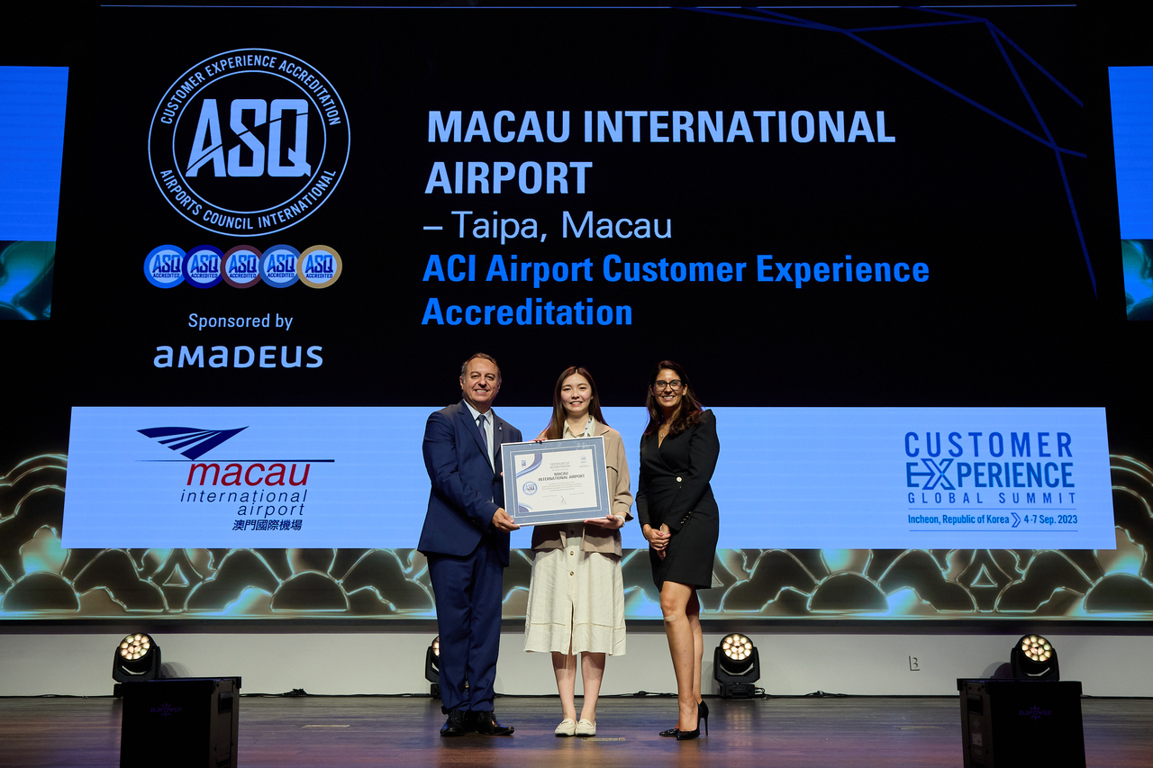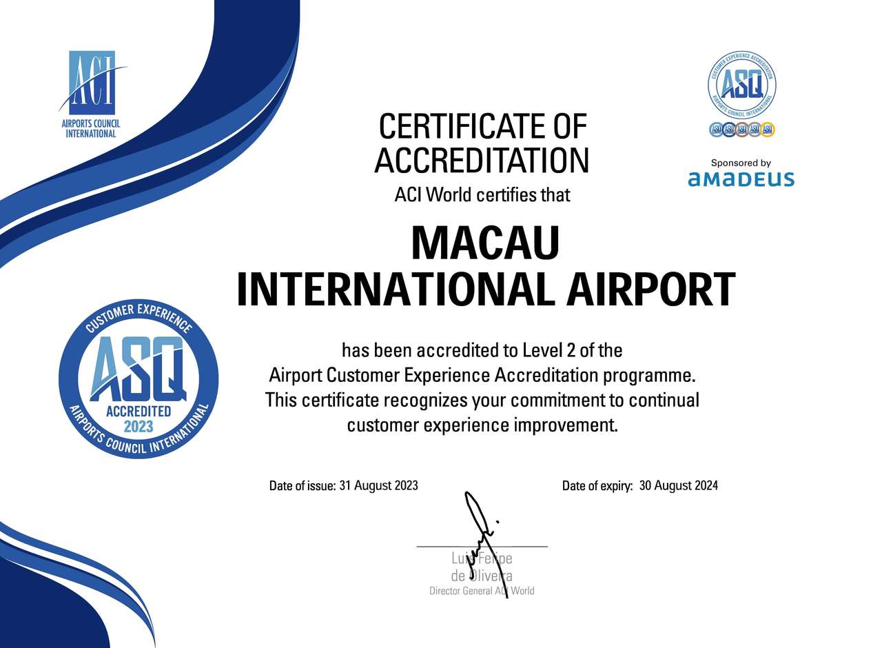澳门国际机场於2023年9月1日成功获国际机场协会(ACI)续颁【机场客户体验认证】第二级,在此感谢所有工作团队 : 他们共同努力为机场旅客提供优质的客户体验,助澳门国际机场在2023年续获这一殊荣。