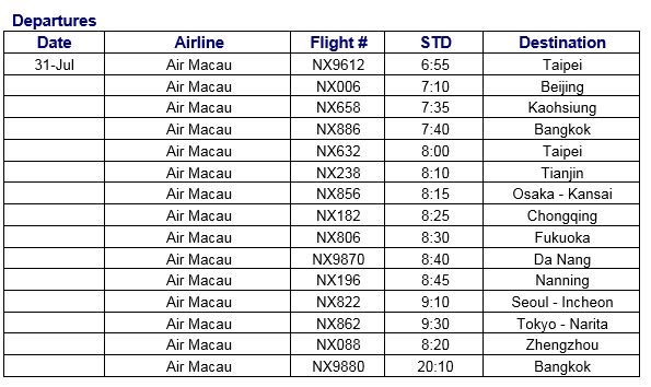 Due to the influence of Typhoon signal no.3, Macau International airport informs that the following flights will be cancelled according to the airlines’ updates. The airport reminds all passengers to follow the updates of their flights with their respective airlines.