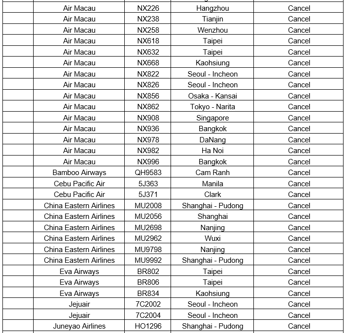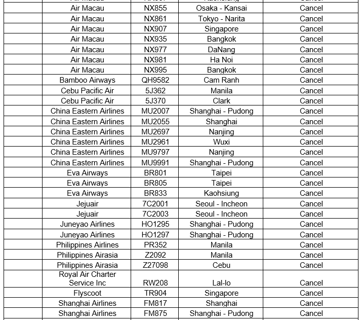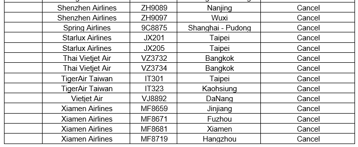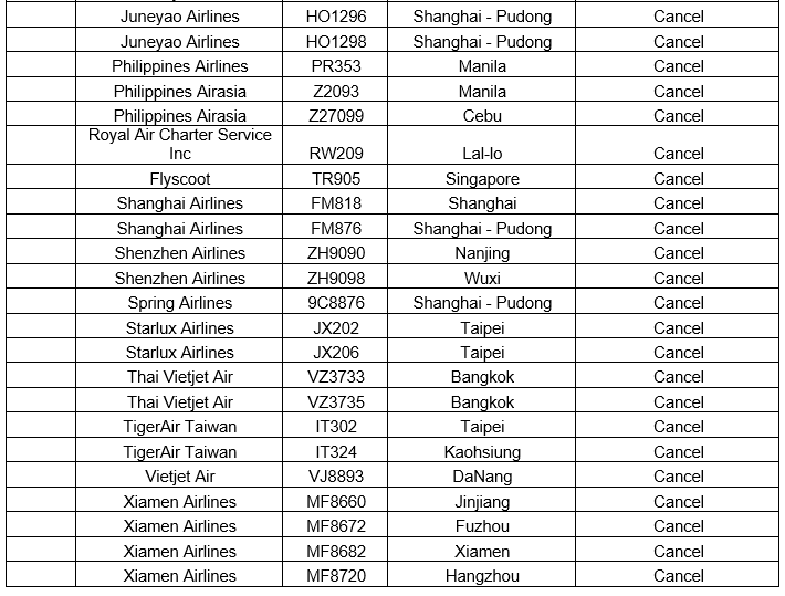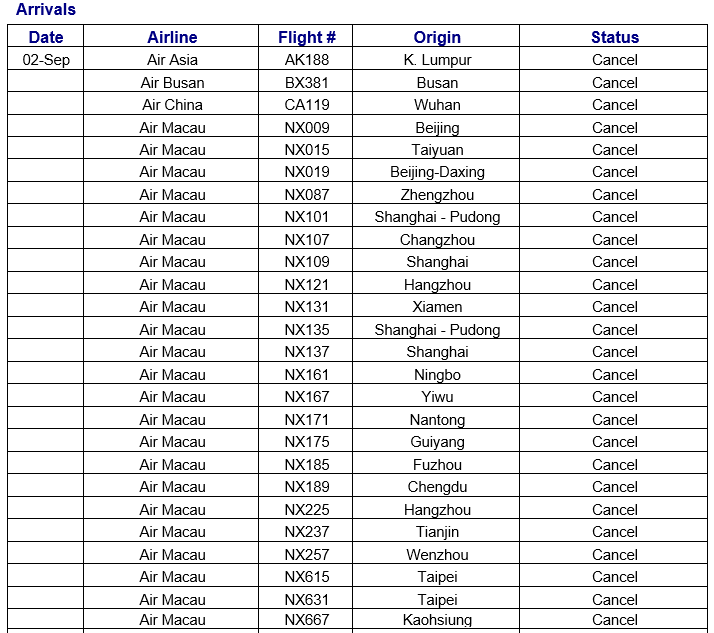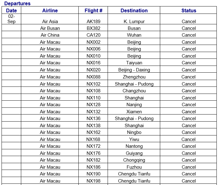 Due to the influence of Typhoon “Saola”, Macau International Airport informs that the following flights will be cancelled according to the airlines’ updates. The airport reminds all passengers to follow the status of their flights with their respective airlines.
