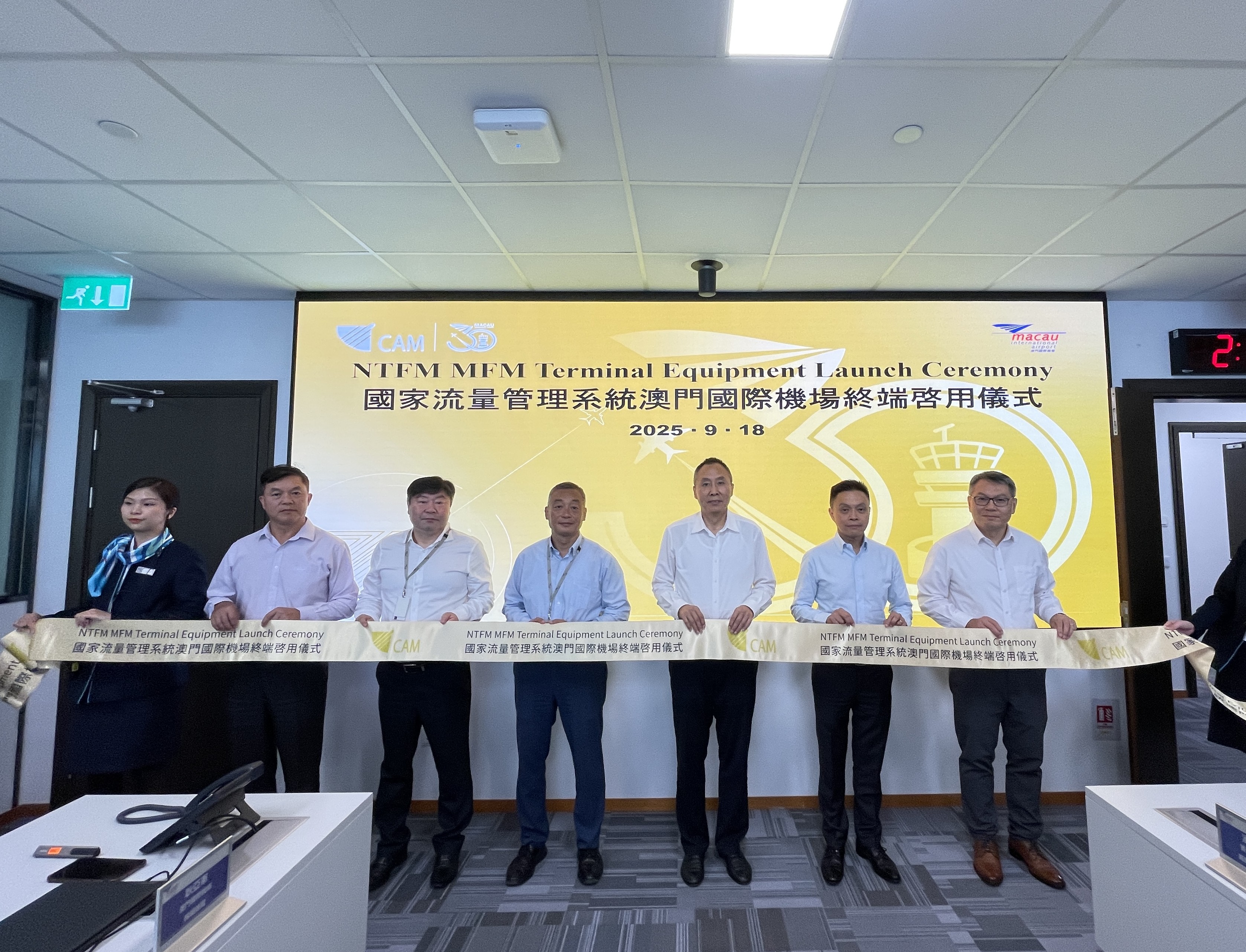 On 18th September 2025, the launch ceremony for the National Air Traffic Flow Management System (NTFM) Macau International Airport (MIA) Terminal was held at Macau International Airport. The launch ceremony was attended by delegations from Director General of Air Traffic Management Bureau (ATMB) of Civil Aviation Administration of China (CAAC) Mr. Maio Xuan, President of the Civil Aviation Authority of Macao (AACM) Mr. Stanley Pun, Director General of the Hong Kong Civil Aviation Department Mr. Liu Chi-yung, and Chairman of Executive Committee of CAM Mr. Chan Weng Hong. This milestone event marks the official connection of Macau to the NTFM as the first overseas user of the system, substantially enhancing air traffic control collaboration capabilities within the Guangdong-Hong Kong-Macao Greater Bay Area. All operational entities at MIA will enter a results-oriented operational model based on the release times provided by the system, accelerating the workflow across all support processes to ensure flights depart according to the assigned slot time and improving the overall operational efficiency of the airport.
