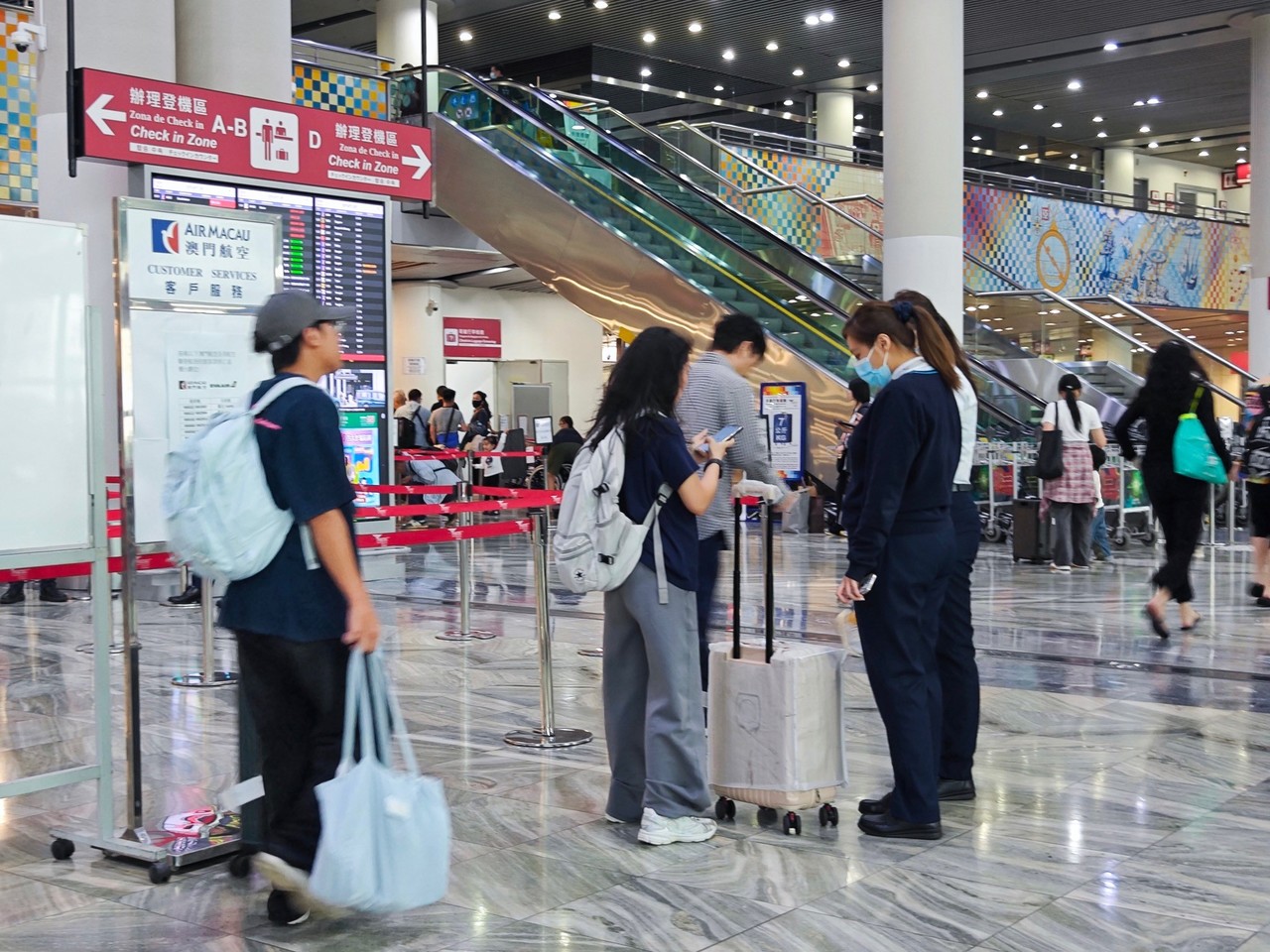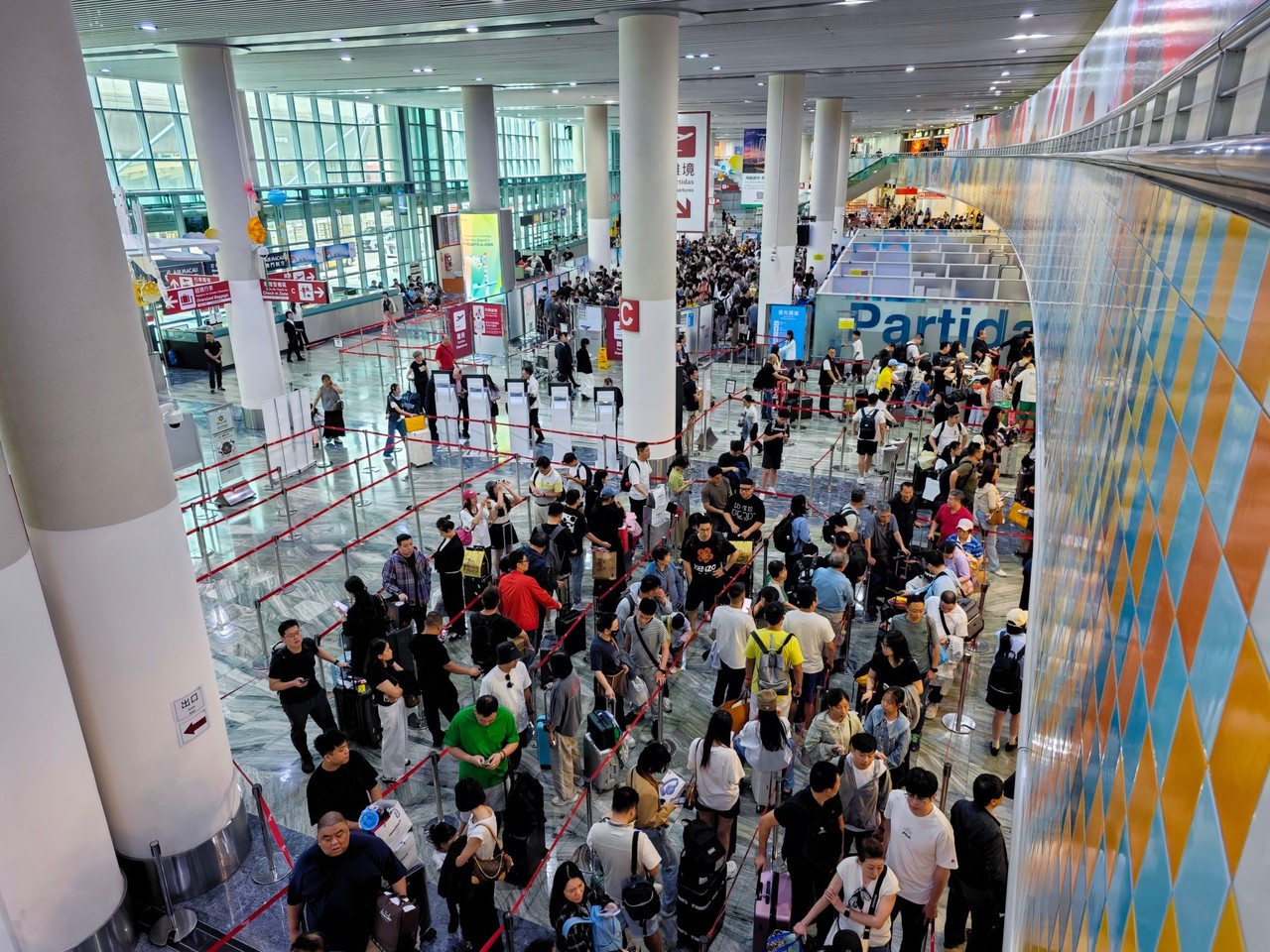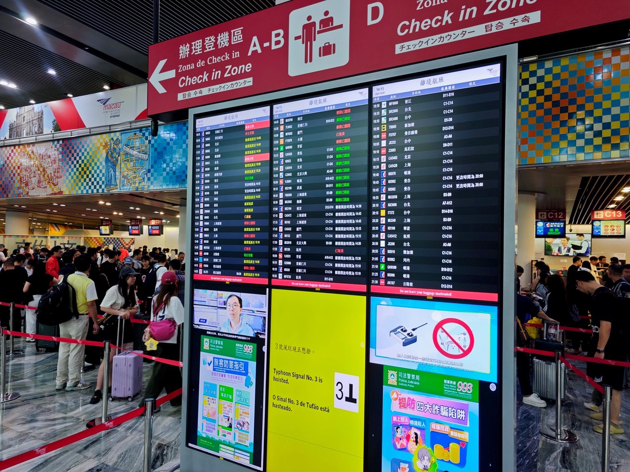 The Macao Meteorological and Geophysical Bureau has lowered the typhoon signal from No. 8 to No. 3 at 1 pm today (5th October 2025). As Typhoon Matmo weakens, Macau International Airport (MIA) is progressively restoring flight operations. Affected passengers arrived at the airport in anticipation of their journeys.