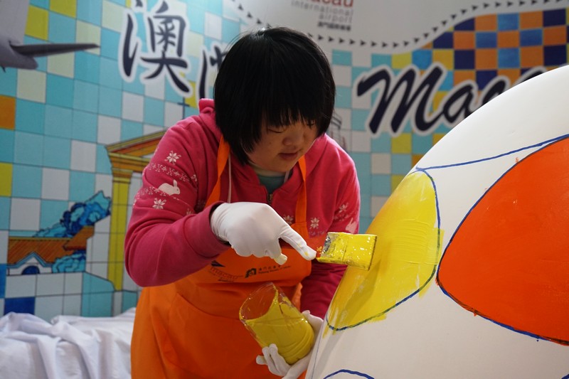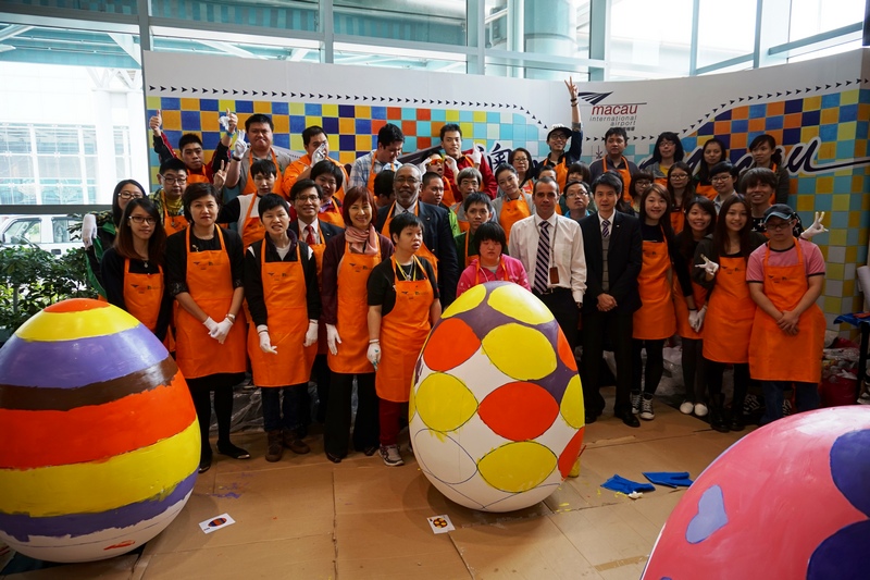 The “Colour the Joy of Life” event took place on Tuesday, 15th April 2014 at the Macau International Airport Terminal Building to celebrate the Easter Season. Around 30 students and instructors from Fu Hong Society arrived at the Airport early in the morning, after putting on the specially designed aprons, Fu Hong students kicked off a great creation project at the Airport – painting ten giant Easter eggs. Each egg is 1.5 meter in height, students painted out beautiful patterns and lines on the eggs, turning them to be colourful and meaningful artworks. This event was organized by Macau International Airport in conjunction with Fu Hong Society.