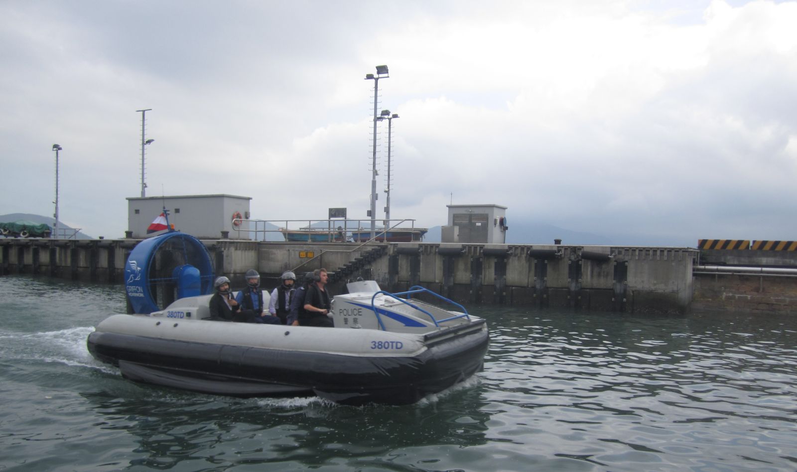 是次考察先由技術人員以簡報方式介紹了水陸兩用氣墊船之各種型號、工作原理及用途,包括在任何淺灘上進行搜救工作及展示世界各地之使用實例。隨後,機場代表視察氣墊船實物,該氣墊船屬於新型號之小型船隻,使用兩台柴油引擎,最多能運載5人或負重380公斤,最高航行速度每小時30海里。各代表成員亦親身試坐氣墊船出海,並在海上進行有關船體操作及拯救示範,充分了解到該氣墊船在水陸兩用之功能、登陸實況、靈活的變速效能及良好的拯救能力。