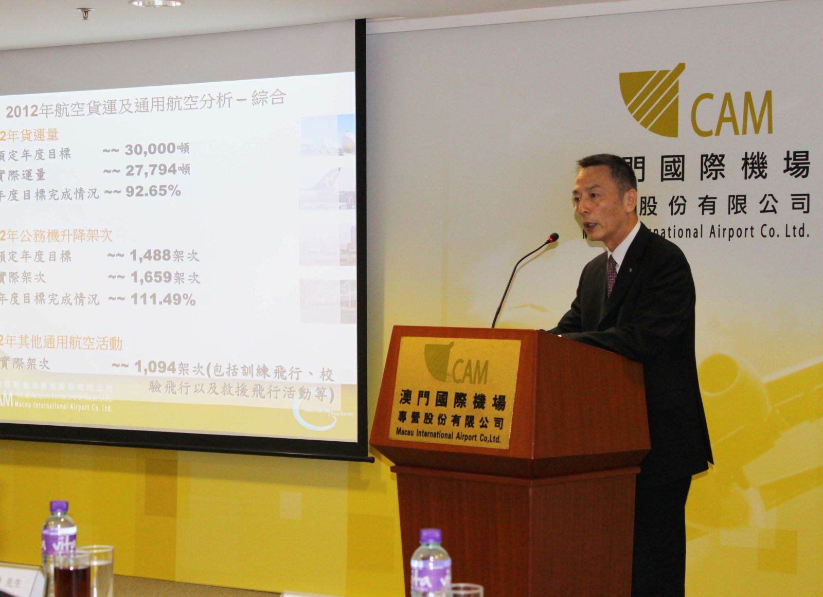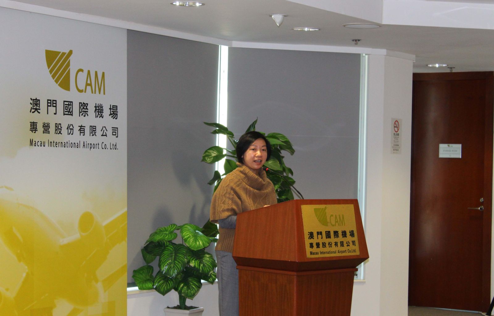 2013年1 月25日,澳門國際機場專營股份有限公司(CAM)在公司大樓五樓會議室舉行2012 年業務總結及2013 年工作計劃會議。董事局主席馬有恆先生、執行委員會主席鄧軍博士、執行董事徐偉坤先生和梁少培先生、ADA機場管理公司董事局主席劉蘇寧女士(前任CAM執行董事)、公司秘書林笑雲大律師,帶領公司全體員工出席,各部門總監及兩辦事處首席代表分別報告去年業務成效及對新一年業務發展方向作出展望及行動規劃。