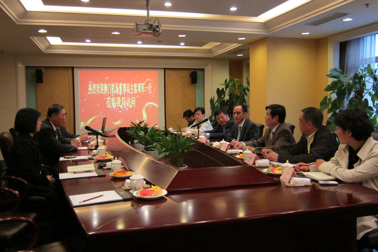 2011 年 11 月 14 日董事局鄧軍主席與財務暨行政部鄭淑群總監赴上海公幹。 行程中先與上海代表辦事處進行了業務交流, 之後在辦事處安排及由首席代表葉洪先生及經理彭雲風先生的陪同下, 拜會了中國民航華東地區空中交通管理局, 目的為繼續促成中葡澳三地民航發展及合作, 介紹由本公司贊助培訓中國內地及澳門的空管人員及機場管理幹部而設的赴葡學習計劃, 邀請華東空管局選派空管員於明年前赴葡萄牙里斯本空管中心 NAV 公司進行空管培訓課程。 華東空管局陳獻林局長在瞭解到此計劃內容及多年來已有超過 400 多位的中國民航及澳門學員受益的成果後, 對此培訓項目表示贊同及澳門國際機場對中國民航的貢獻表示感謝; 此外, 陳局長談到其現任華東空管局的副局長王正育先生 (剛外派公幹) , 多年以前獲派往澳門國際機場當空管員時, 學習到融會了東西方管理技術的知識及文化, 累積了寶貴的經驗有助日後的工作發展。 陳局長其後更熱情地招待了本公司及其單位內業務人員一同共進晚宴。 出席的華東管理局人員還包括了華東空管局黨委副書記暨紀委書記馮惠勇、局長助理孫濤、培訓中心沈建華黨委書記、空管部副部長葉建菁、人力資源部副部長邢曉波等。