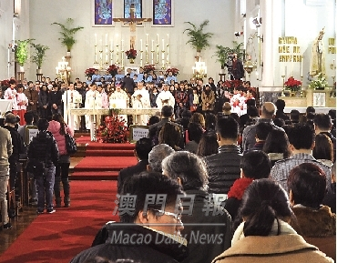 本澳天主教會各區教堂均舉行子夜彌撒,除虔誠教徒參與,亦有不少遊客慕名而至。一如以往,到主教座堂參加子夜彌撒的人數最多,有近千人出席。踏入子夜○時,子夜彌撒正式開始,聖誕鐘聲響遍全城。主教座堂子夜彌撒由天主教澳門教區主教黎鴻昇主持,行政法務司司長陳麗敏、民政總署管委會主席譚偉文等出席,嘹亮詩歌、悠揚聖樂、動人宗教故事,呈現一派莊嚴、祥和氣氛。