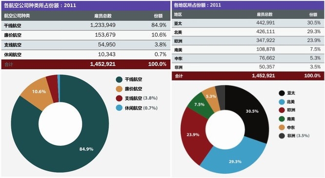 分析主要的航空公司類型,可以明顯發現幹線航空公司雇傭人數最多,市場份額多達85%。考慮到在基於2011年旅客流量的最近的前200名排名中,110家幹線運營商佔據著重要地位,因此這並非完全出人意料。