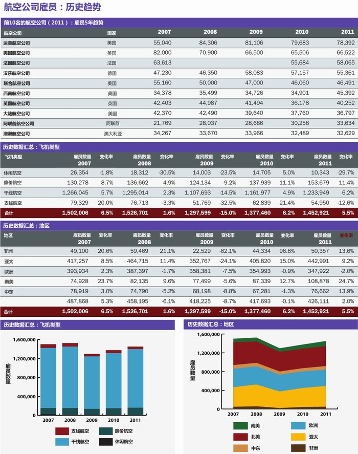 從全球層面來看,亞太地區航空公司勞動力占了30.5%,緊接著是北美(29.3%)和歐洲(23.9%)。在過去的5年間,北美地區員工人數降幅最大,達-12.7%,減少了61000名員工。自2007年以來,相鄰的南美則明顯增長,達45.3%,而亞太地區總的增長為6.2%。在這5年期間,歐洲和中東地區員工分別減少了-11.7%和-2.9%。
