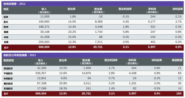 •2011年亞太地區航空公司淨成果最高,達到50億美元。