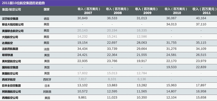 •2011年漢莎航空集團收入最高,達到400億美元。