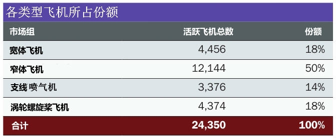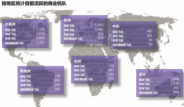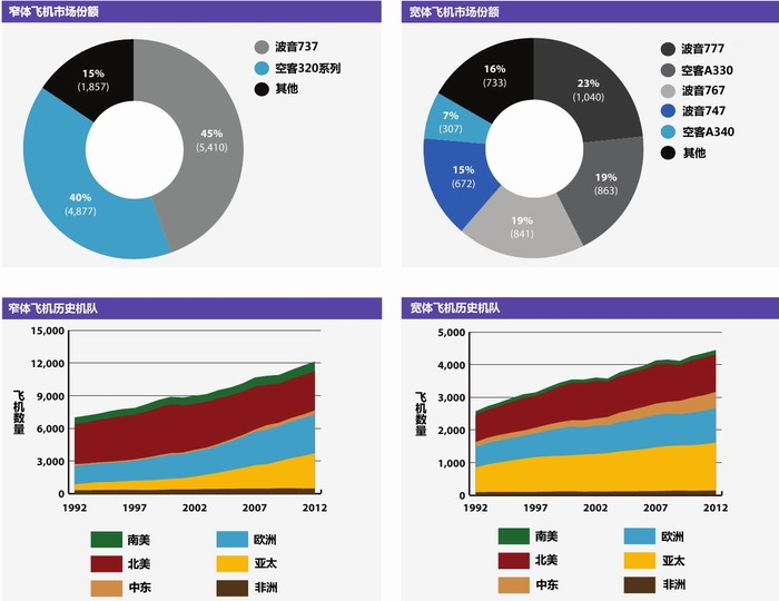 截至2012年11月,世界上運營的商用飛機總共為24350架。北美地區所占的市場份額最大(33%),其次是歐洲(36%)、亞太地區(24%)、南美(8%)、非洲(5%)和中東(4%)。北美地區的窄體飛機、支線噴氣飛機和渦輪螺旋槳飛機數量最多,儘管亞太地區寬體飛機的數量最多,略多於北美地區。窄體噴氣式飛機占了世界飛機數量的50%,寬體飛機占全球份額的18%。支線噴氣飛機和渦輪螺旋槳飛機市場集團在全世界所占的份額分別為14%和18%。