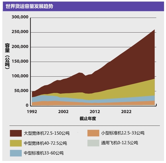 國際民航組織的資料表明貨運交通(噸/千米)隨著全球GDP的增加而增加,但具有短暫的停滯和下降情況,這是通過貨運飛機容量的增長得以實現的。20世紀90年代中期以來,大型飛機能提供越來越大的運力。1980年,大型寬體飛機運力占30%,1990年增長到36%,2000年增長到43%,2010年增長到60%,預計到2031年,會增長至65%。