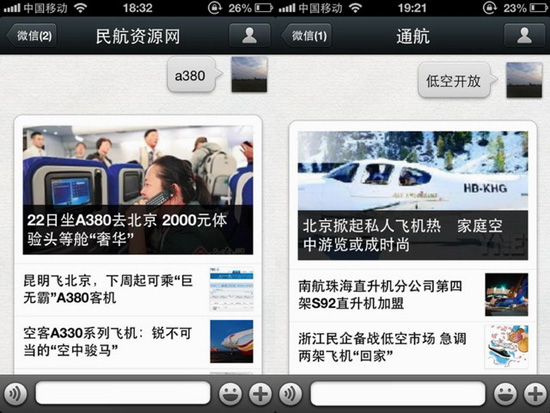 據瞭解,民航資源網微信帳號新聞搜索回復功能於近期推出,使用者通過發送需要查詢的關鍵字,民航資源網微信將會自動生成與該關鍵字相關的圖文資訊即時推送給使用者。比如關注CARNOC微信後,用戶只要發送“A380”,那麼關於“A380”的新聞會生成一個圖文資訊,發送給此使用者。