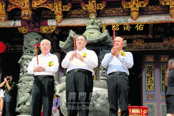 澳門中華媽祖基金會主辦的“第十一屆澳門媽祖文化旅遊節”昨日開幕,由行政長官崔世安等嘉賓主禮並上香,祝願澳門社會風調雨順、繁榮安定,約四千名海內外信衆及嘉賓參與,場面盛大。基金會主席顏延齡表示,媽祖文化旅遊節已成為全球媽祖信衆的一項祈福盛典,也是本澳一年一度的大型品牌活動,期望旅遊節可作為獨具特色的文化平台,為澳門邁向“世界旅遊休閒中心”發揮更大影響力。