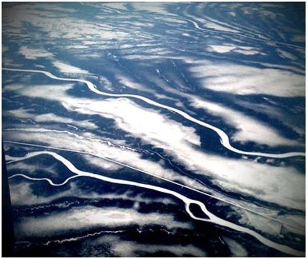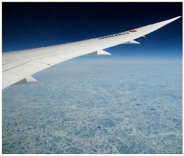 圖:乘坐日航787-8夢幻客機從波士頓飛往東京的旅途中,俯瞰加拿大結冰水域。