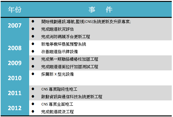 澳門國際機場每一次重大業績的騰飛都離不開基礎設施建設的助推。2004年至2005年貨運的突飛猛進和2007年客運量的再創新高,不能不說基礎設施為之提供了堅實的基礎。在澳門國際機場“安全、效益、效率”大理念的框架下,基建部門根據自身的發展需要提出了以“保證安全、保障容量”為主的發展方向。