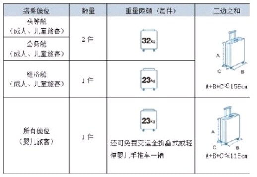 持成人或兒童客票的旅客免費行李額為頭等艙、公務艙兩件行李,每件行李的重量限額為32千克,每件行李的三邊之和不得超過158厘米;
