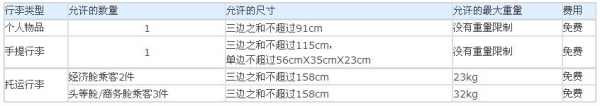 持成人或兒童客票的旅客免費行李額為經濟艙兩件行李,每件行李的重量限額為23 千克,每件行李的三邊之和不得超過158厘米;