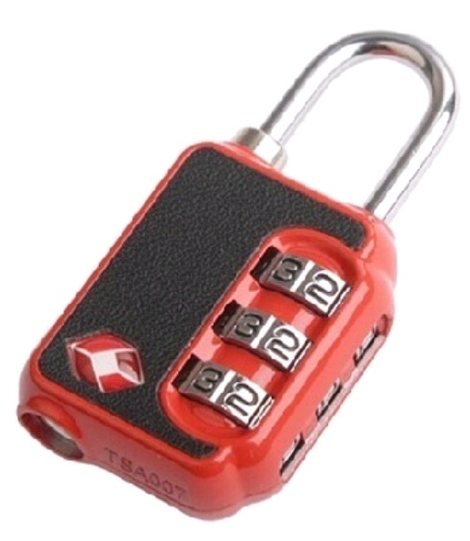 (4)TSA鎖的海關標示:這種鎖的正反兩面一定有一個紅色的菱形標誌,海關只要看到那個標誌,就知道要拿鑰匙開鎖(鎖底部有註明對應鑰匙號碼),而不會撬開破壞;
