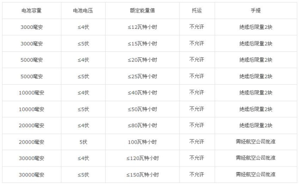 根據國際民航組織《危險物品安全航空運輸技術細則》(2011-2012版)規定,旅客或機組成員為個人自用內含鋰或鋰離子電池芯或電池的便攜式電子裝置(手表、計算器、照相機、手機、手提電腦、便攜式攝像機等)應作為手提行李攜帶登機,並且鋰金屬電池的鋰含量不得超過2克,鋰離子電池的額定能量值不得超過100Wh(瓦特小時),超過100Wh但不超過160Wh的,經航空公司批準後可以裝在交運行李或手提行李中的設備上,超過160Wh的鋰電池嚴禁攜帶。