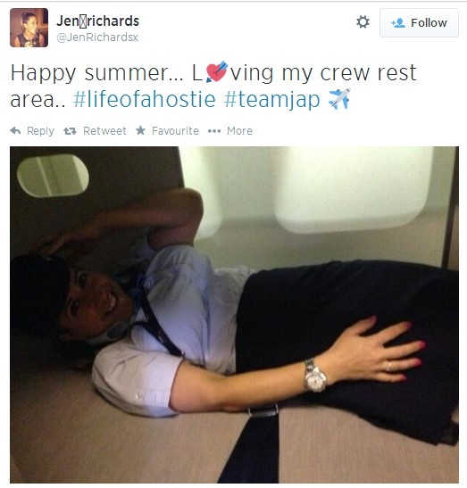 圖:空姐秀自己的鋪位 來源:Twitter用戶 JenRichardsx