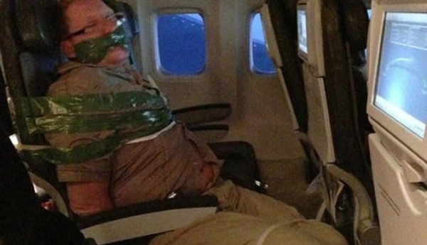 圖:2013年,從冰島雷克雅未克飛往紐約的冰島航空班機上,一名乘客酒後發瘋打人,被其余乘客用膠帶綁在座位上。