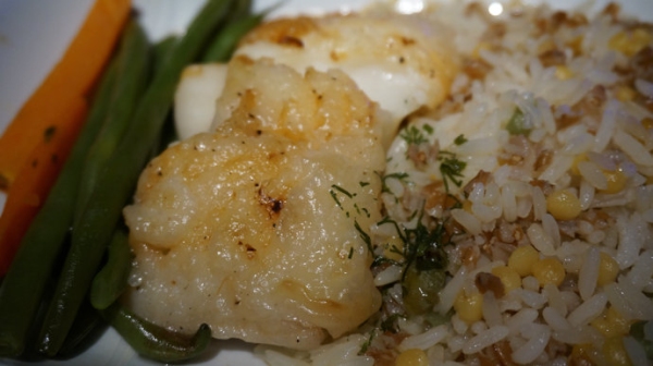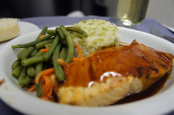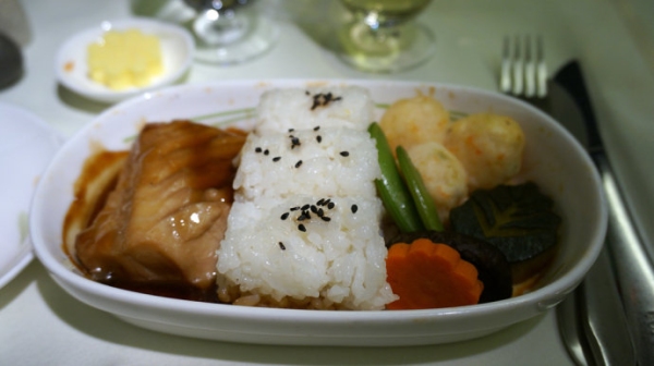在部分歐洲航班,加航提供烤鱈魚配雜糧米飯。鱈魚的柔嫩十分美味,這是我最喜歡的加航主菜。