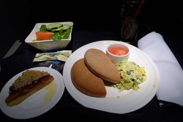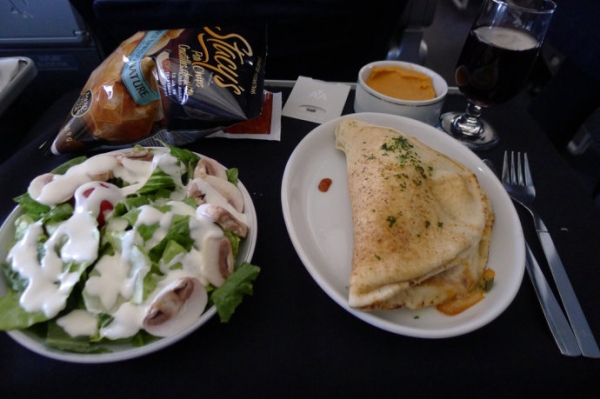依然先來看看美國航空。美航的北美航線商務艙供應的餐食大多比較簡單,一個大份的蘑菇蔬菜沙拉,配上墨西哥雞肉卷,就已經算是不錯的一份熱午餐了。