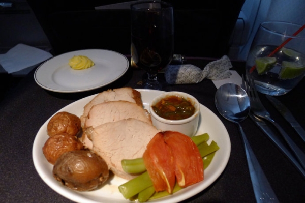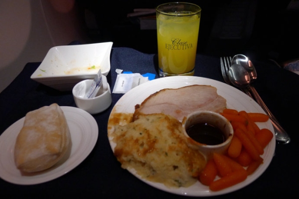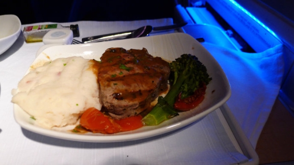 由玻利維亞前往邁阿密的757航班,提供的晚餐是烤豬肉配土豆。大概是受機上設備的影響,餐食明顯已經烤的過幹,屬於質量較差的主菜。