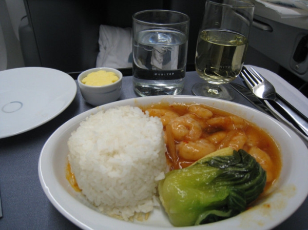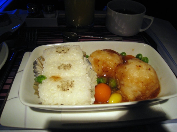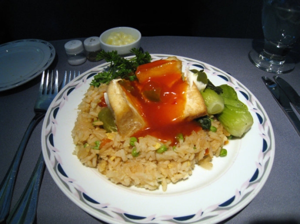 前美國大陸航空商務艙提供的酸甜鱸魚配蛋炒飯,有點類似北美food court中的食物。低廉的品質似乎配不上商務艙的稱號。