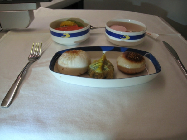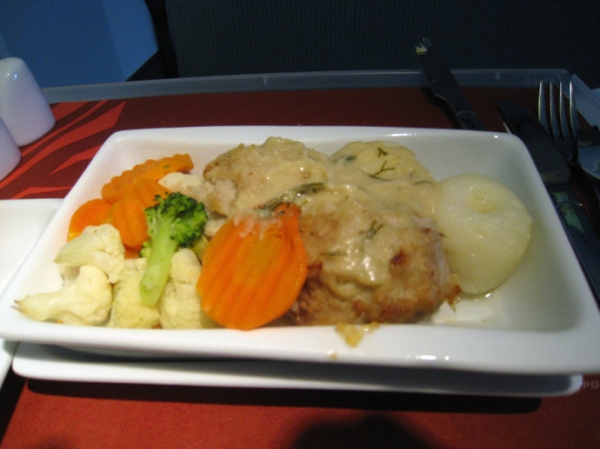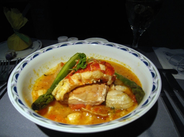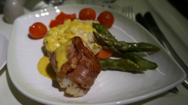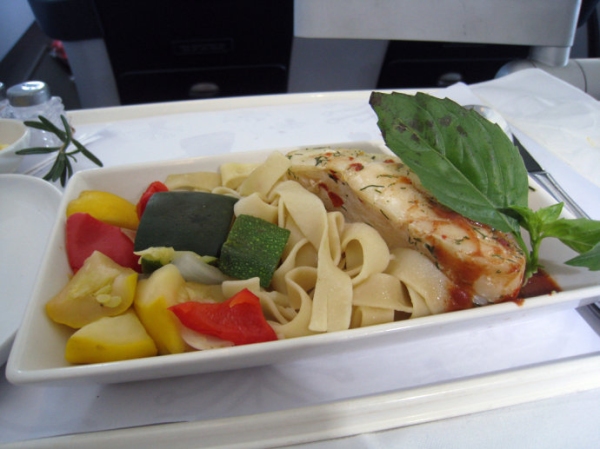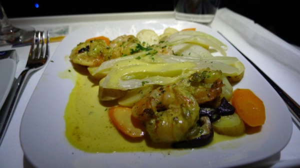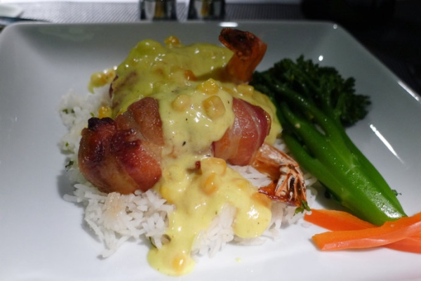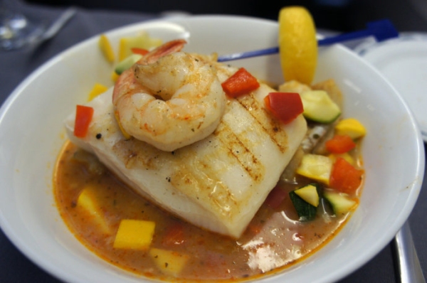 由芝加哥到北京的國際旗艦頭等艙中提供的餐食和前菜一樣比較有南方風味。烙烤培根卷大蝦,配玉米醬汁和蔬菜。西蘭花翠綠脆嫩,在客艙餐食屬難得了。
