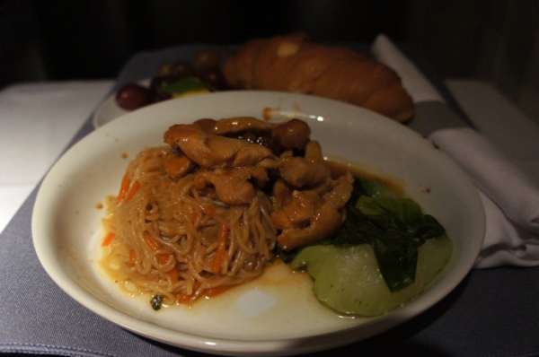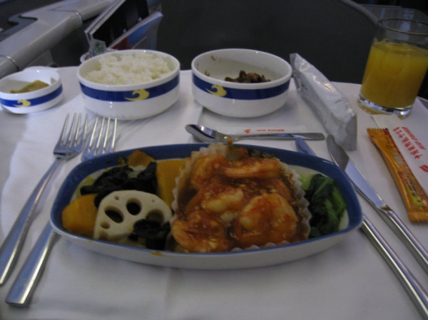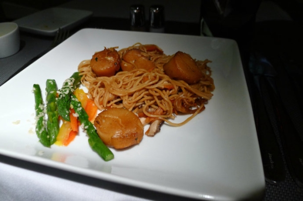 從上海到洛杉磯的國際旗艦頭等艙中供應的中式帶子炒面要遜色一些。帶子有些過老,面條也稍顯軟爛。