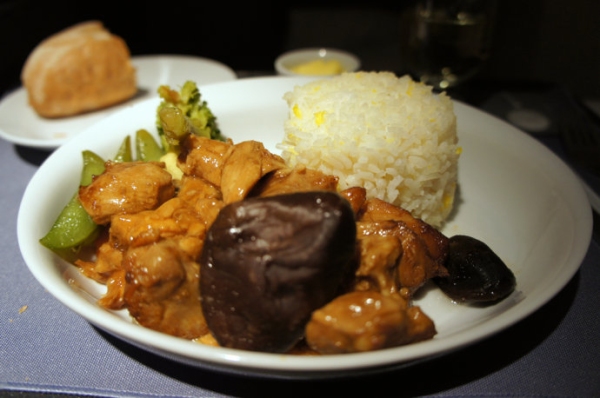 美聯航提供的中餐都有些大學食堂菜的感覺。特別是那一份香菇雞丁,絕對可以和任何一家大學的食堂菜媲美。