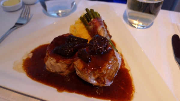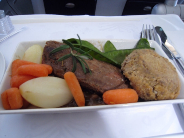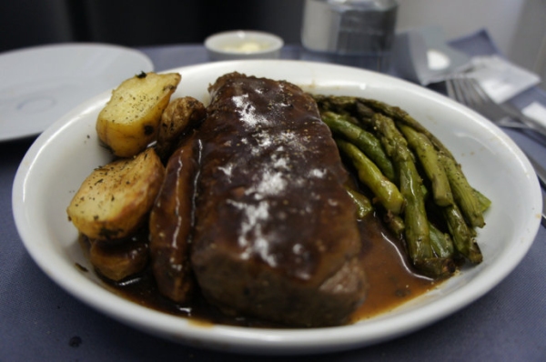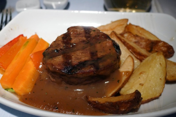 加拿大航空的商務艙菜單通常都一成不變,經典的菜式是艾伯塔省小牛排。加航商務艙供應的牛排雖然賣相不佳,肉質和火候都還算不錯的。