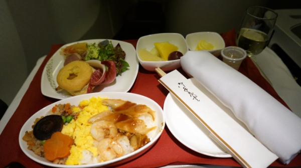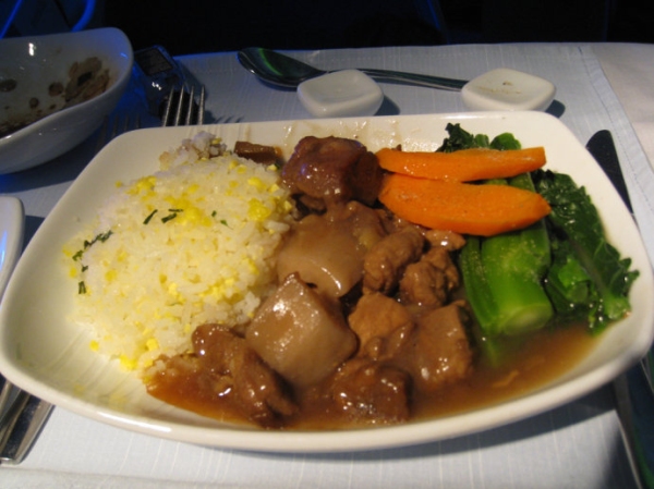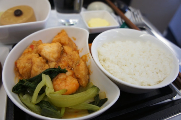 國泰航空是很多人眼中的一個傳奇,然而我的體驗卻比較一般。國泰的米飯似乎是裝在碗中加熱的,第一張圖可以清楚地看到邊緣的米飯已經變硬。