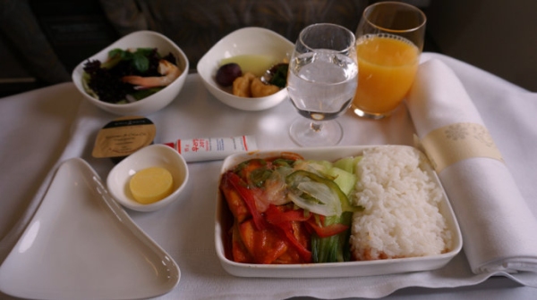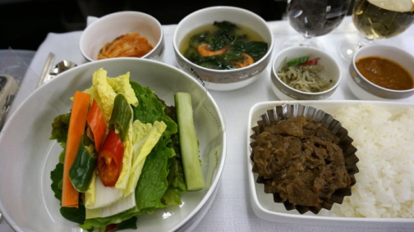韓亞航空的商務艙主菜比前菜有很大提高,蔬菜卷烤牛肉也是韓餐的特色。在短途航線,韓亞航空提供九宮格便餐服務,雖然內容簡單,但是顏色也很吸引人。